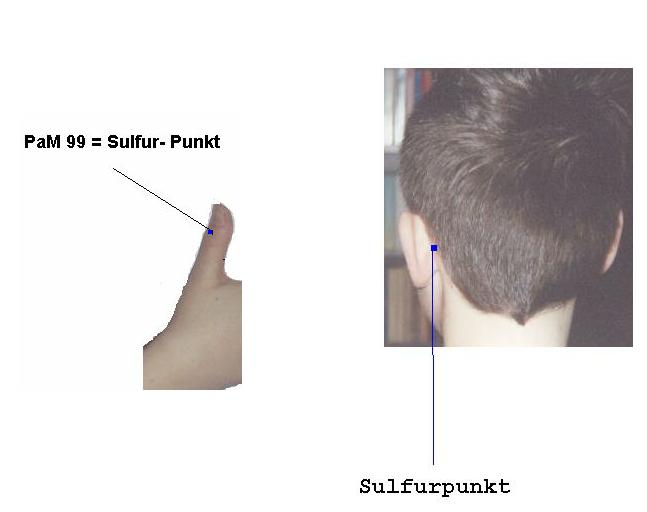 Punkt entspricht dem Punkt PaM 99. PaM 99 besteht aus 3 Punkten Der Sulfur- Punkt entspricht dem zweiten Punkt = in der Mitte des Daumensrückens, etwa 1 fen vom Nagel entfernt. Am Ohr entspricht der Sulfur-