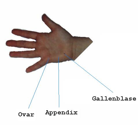 Der Nierenpunkt liegt weiter distal ca 1Querfinger von der Schwimmhaut zwischen dem Ringfinger und dem Kleinfinger.