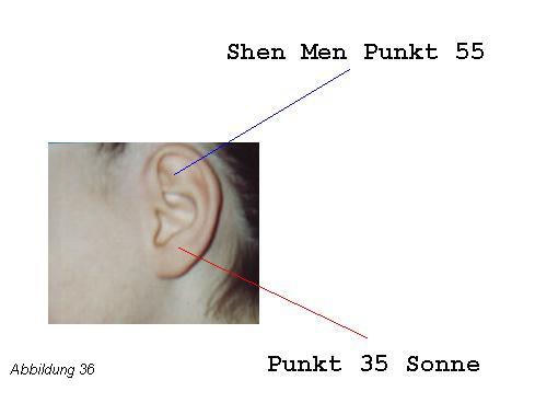 - Shen Men. Punkt 55 chinesisch, Tor der Götter: Liegt auf dem Crus superius der Anthelixwurzel. Die Behandlung dieses Punktes soll nach der