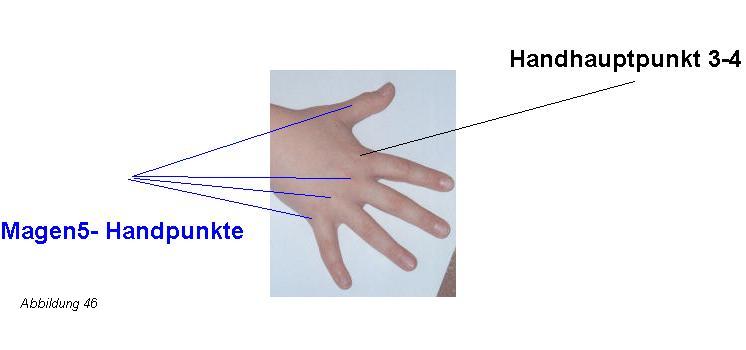 verschwinden gleichzeitig nach Behandlung des Magen5- Halspunktes. Die Punkte liegen auf den Metacarpalköpfchen 1,3,4,5 und ein Punkt in der Mitte der proximalen Phalanx des Daumens. Auf dem Capitilum metacarpi2 liegt ein Punkt, der den Handhauptpunkt 3-4 ausschaltet.